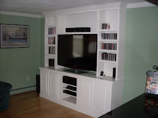 Its been a while since my last post, so I thought an update was due. I've been mainly painting the last couple months. I'm sort of falling into more interior painting jobs, customers who hire me for woodworking will ask if I also paint, and that seems to happen more and more. I guess its one less contractor the homeowner has to deal with so its convienant for them, I get a break from sucking sawdust for awhile and more buisness.... both parties win. The wall unit is an older project that I thought I'd post but never did, all the open shelf space will be filled with adjustable shelves. The wainscot in this living room was part of a large painting job, the chair rail was already in place, I added the shadow boxes and then painted the rest of the room, the kitchen/dining area, foyer, and two bedrooms. The last pic is a small cabinet I made for a stereo receiver/cable box and dvd storage. Thanks for reading.